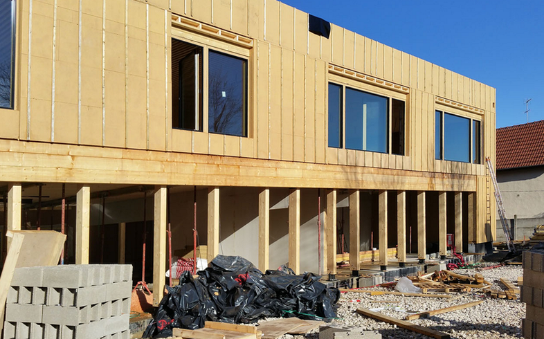 Système constructif : Ossature bois / Toiture végétalisée / Plancher mixte bois-béton / Isolation paille / Menuiserie